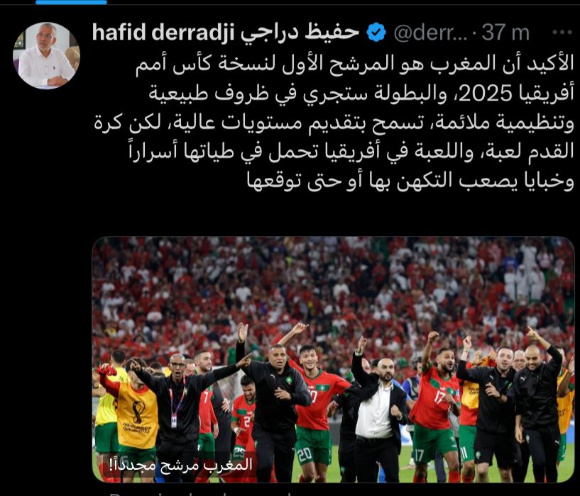 على بُعد حوالي 24 ساعة من انطلاق منافسات كأس أمم إفريقيا 2025، تتواصل ردود الفعل والتحليلات حول حظوظ المنتخبات المشاركة، حيث عبّر الإعلامي الجزائري حفيظ الدراجي عن قناعته بأن المنتخب المغربي يمتلك أفضلية واضحة للمنافسة على اللقب القاري.